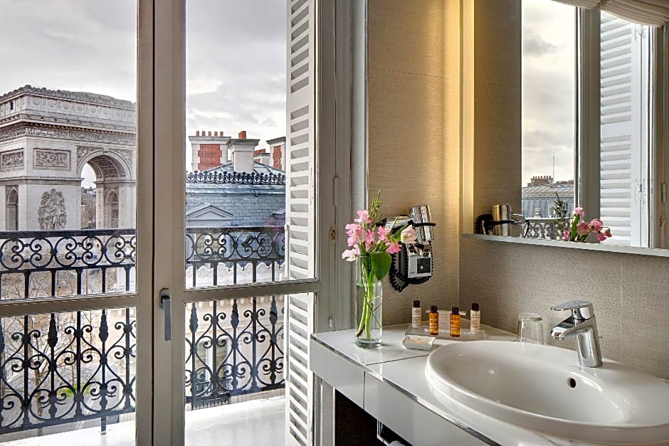 This soundproofed suite features a separate seating area and a direct view of the Arc de Triomphe.